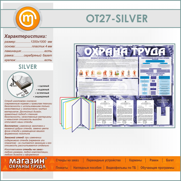 Стенд «Охрана труда» с перекидной системой, 3 плоскими и 1 объемным карманом (OT-27-SILVER) в Химках купить