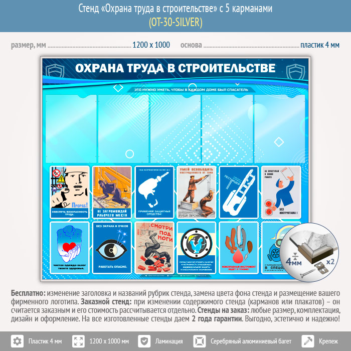Стенд «Охрана труда в строительстве» с 5 карманами (OT-30-SILVER) в Химках купить