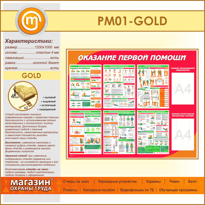 Стенд «Оказание первой помощи» с плоским и объемным карманами (PM-01-GOLD) в Химках купить