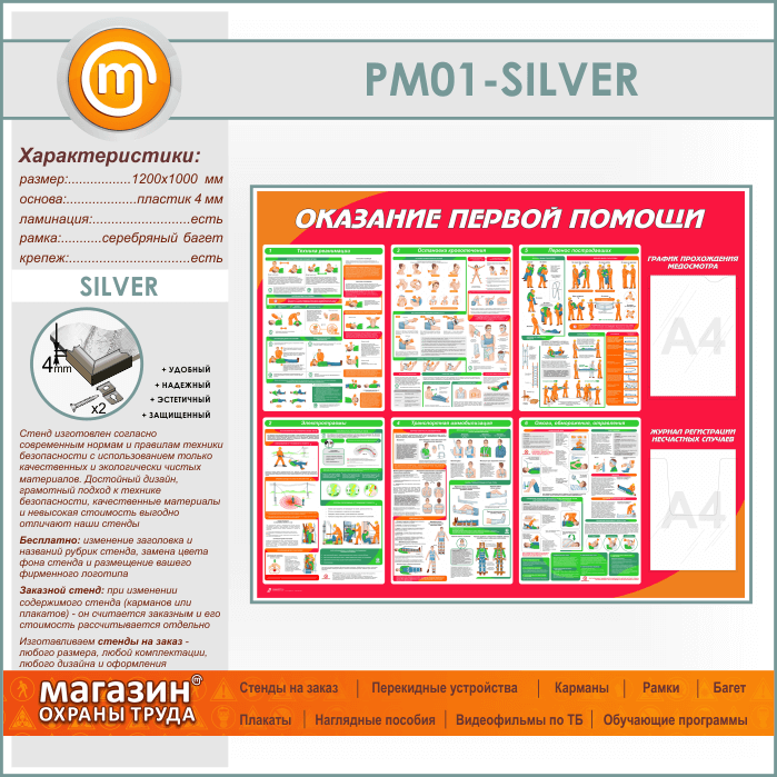 Стенд «Оказание первой помощи» с плоским и объемным карманами (PM-01-SILVER) в Химках купить