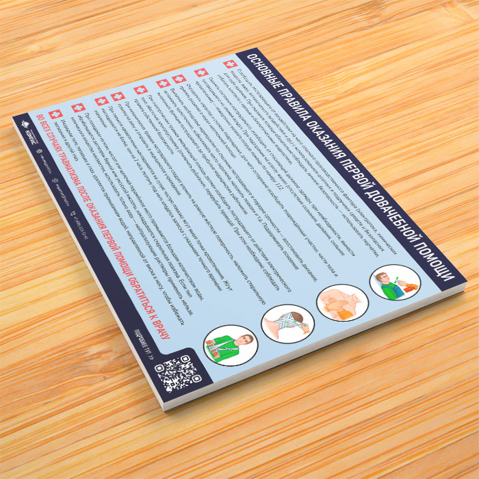 Плакат «Основные правила оказания первой доврачебной помощи» может быть изготовлен любого формата и размера, на бумаге, самоклеящейся пленке, пластике, баннерной ткани и металле. Разрабатываем, рисуем и изготавливаем плакаты на любую интересующую Вас тематику