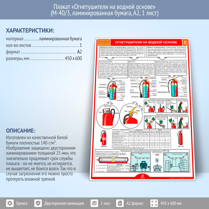 Плакат «Огнетушители на водной основе» (М-40/3, ламинированная бумага, А2, 1 лист) в Химках купить