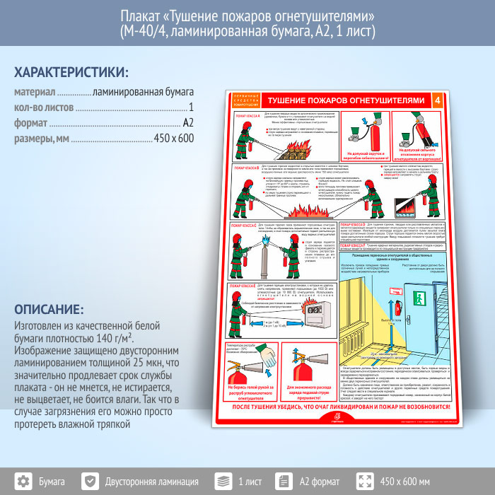 Плакат «Тушение пожаров огнетушителями» (М-40/4, ламинированная бумага, А2, 1 лист) в Химках купить