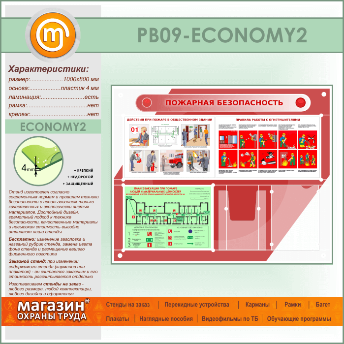 Стенд «Пожарная безопасность» с планом эвакуации, плоским и объемным карманами (PB-09-ECONOMY2) в Химках купить