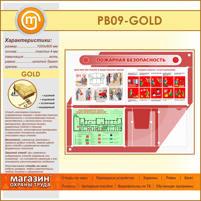 Стенд «Пожарная безопасность» с планом эвакуации, плоским и объемным карманами (PB-09-GOLD) в Химках купить