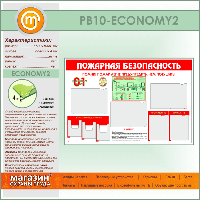 Стенд «Пожарная безопасность» с планом эвакуации, 5 плоскими и 3 объемными карманами (PB-10-ECONOMY2) в Химках купить