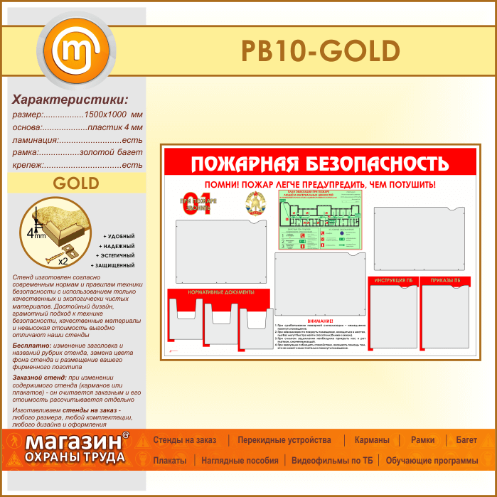 Стенд «Пожарная безопасность» с планом эвакуации, 5 плоскими и 3 объемными карманами (PB-10-GOLD) в Химках купить