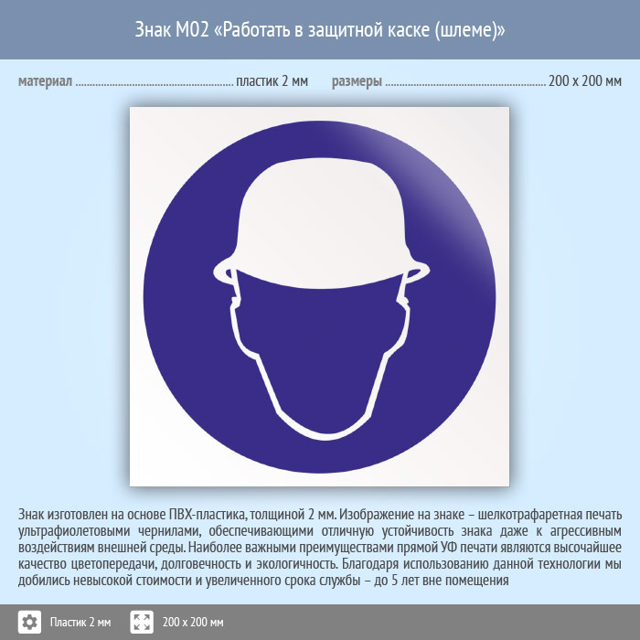 Знак M02 «Работать в защитной каске (шлеме)» (пластик, 200х200 мм) в Химках купить