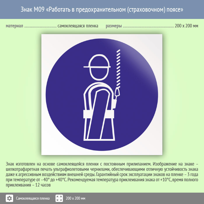 Знак M09 «Работать в предохранительном (страховочном) поясе» (пленка, 200х200 мм) в Химках купить