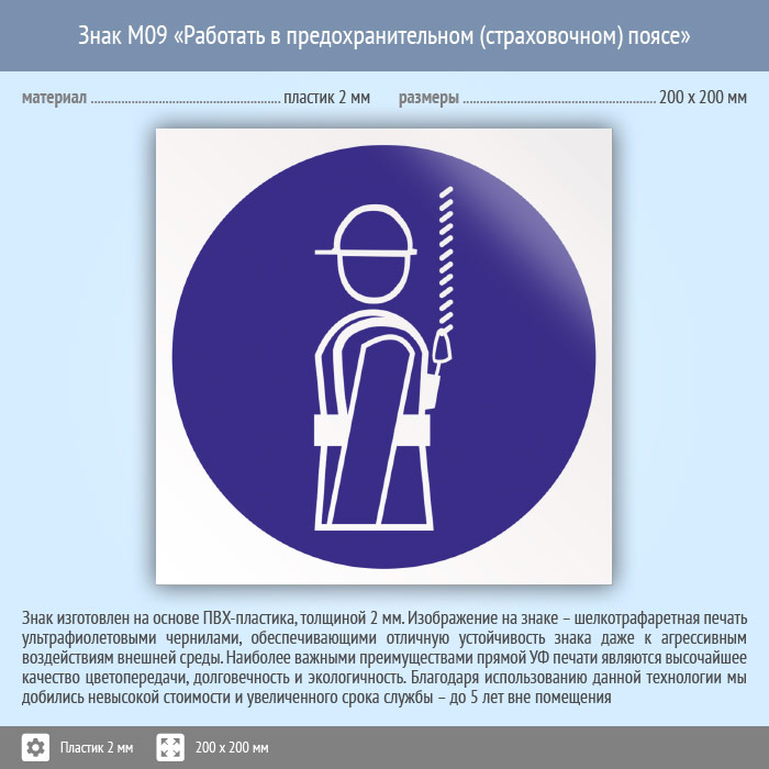 Знак M09 «Работать в предохранительном (страховочном) поясе» (пластик, 200х200 мм) в Химках купить