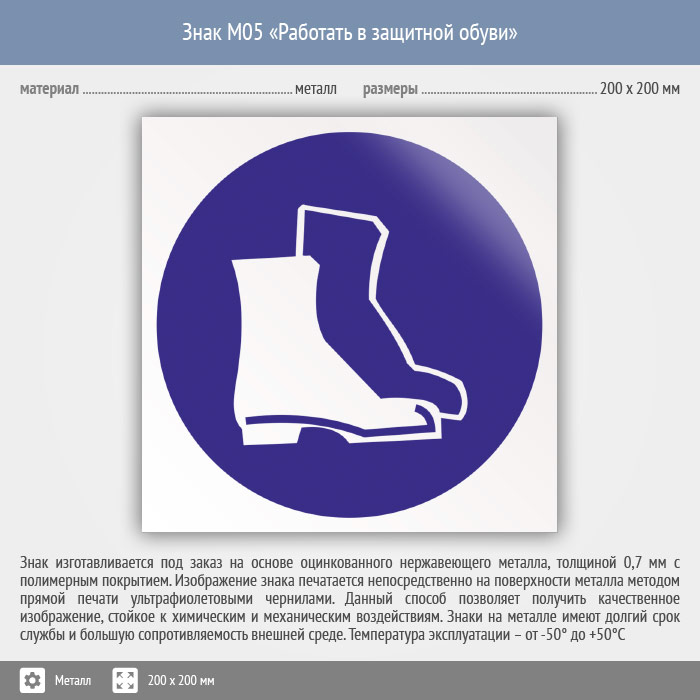 Знак M05 «Работать в защитной обуви» (металл, 200х200 мм) в Химках купить