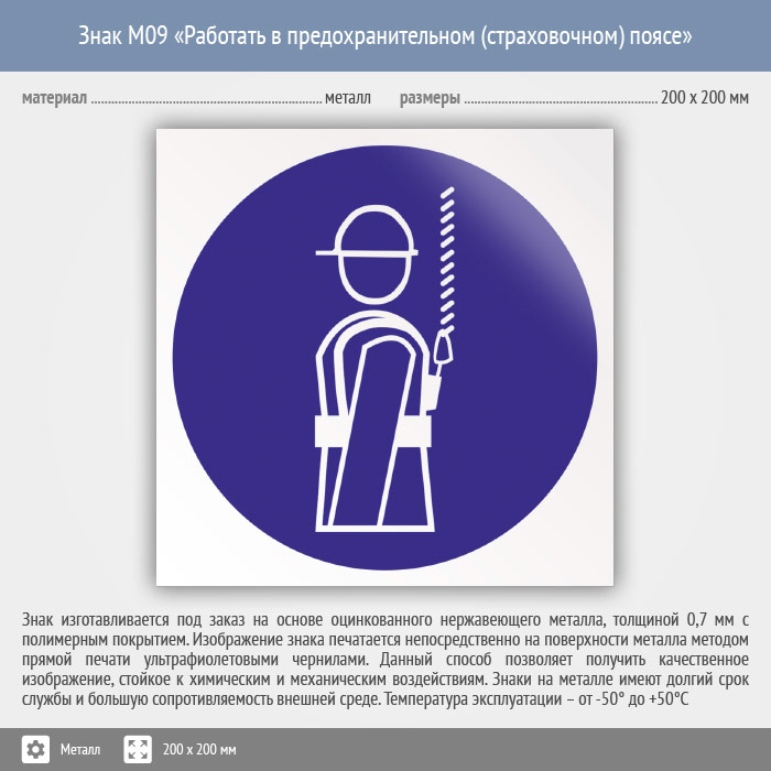 Знак M09 «Работать в предохранительном (страховочном) поясе» (металл, 200х200 мм) в Химках купить