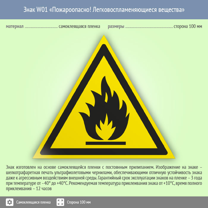 Знак W01 «Пожароопасно! легковоспламеняющиеся вещества» (пленка, сторона 100 мм) в Химках купить