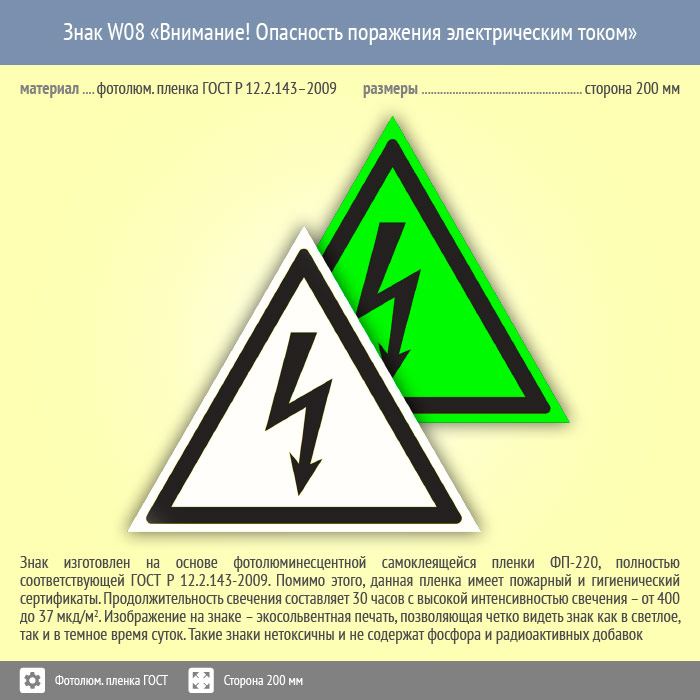 Знак W08 «Внимание! Опасность поражения электрическим током» (фотолюминесцентная пленка ГОСТ 34428-2018, сторона 200 мм) в Химках купить