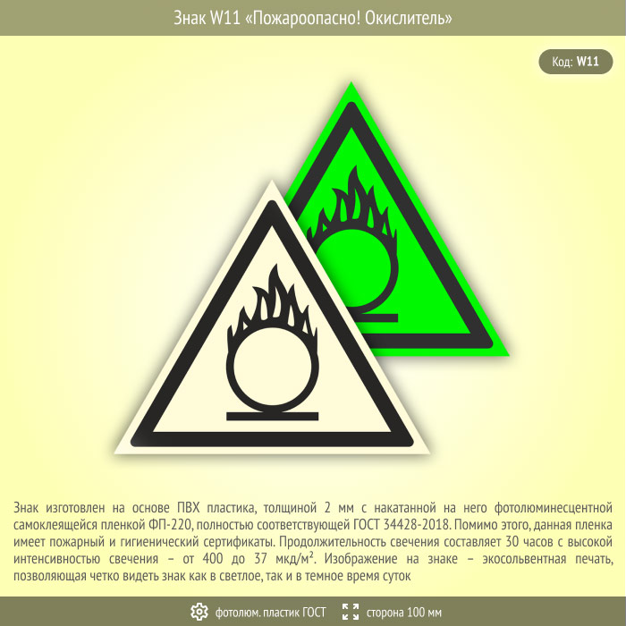 Знак W11 «Пожароопасно! Окислитель» (фотолюминесцентный пластик ГОСТ 34428-2018, сторона 100 мм) в Химках купить