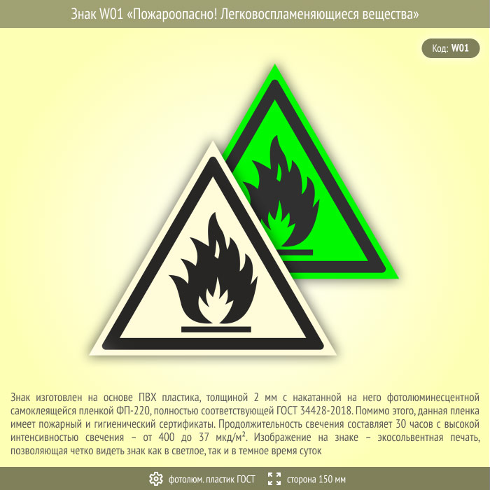 Знак W01 «Пожароопасно! Легковоспламеняющиеся вещества» (фотолюминесцентный пластик ГОСТ 34428-2018, сторона 150 мм) в Химках купить