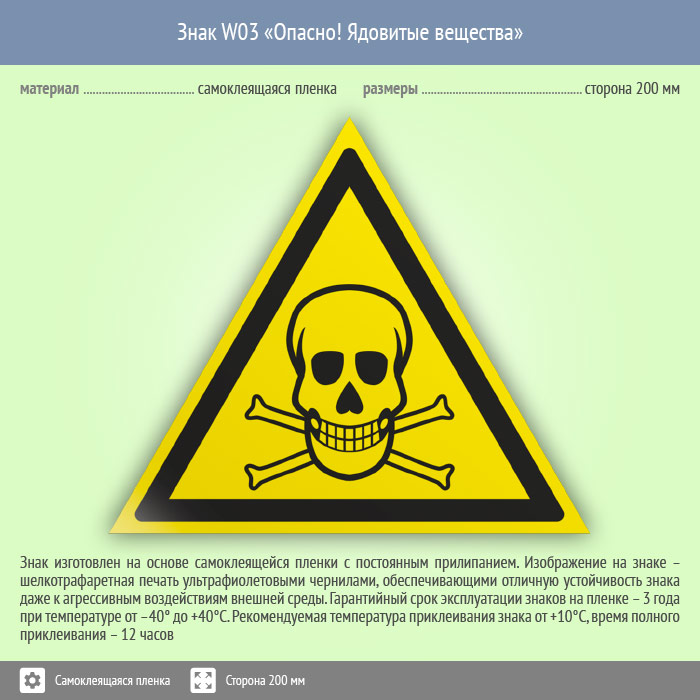 Знак W03 «Опасно! ядовитые вещества» (пленка, сторона 200 мм) в Химках купить