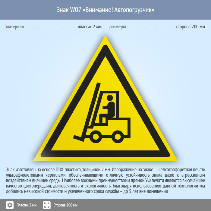 Знак W07 «Внимание! автопогрузчик» (пластик, сторона 200 мм) в Химках купить