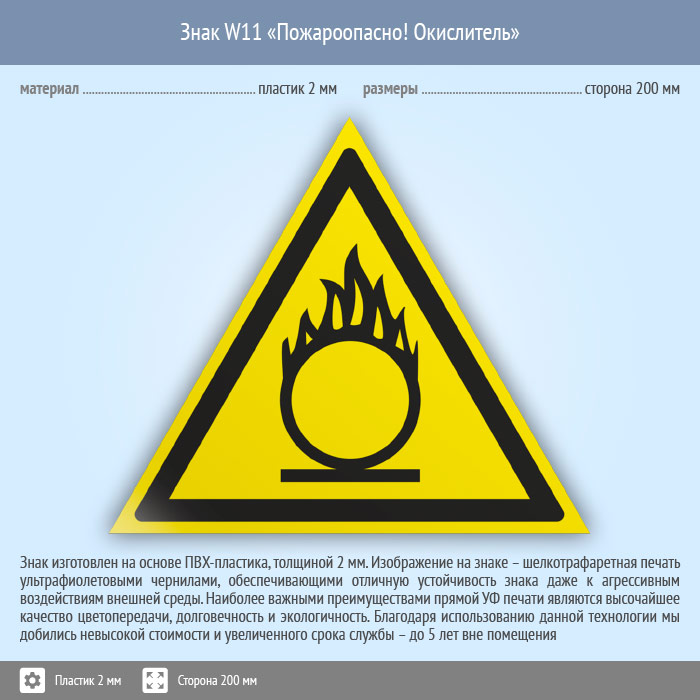 Знак W11 «Пожароопасно! окислитель» (пластик, сторона 200 мм) в Химках купить