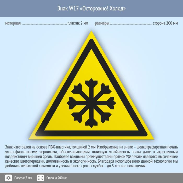Знак W17 «Осторожно! холод» (пластик, сторона 200 мм) в Химках купить