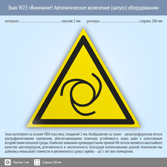 Знак W25 «Внимание! автоматическое включение (запуск) оборудования» (пластик, сторона 200 мм) в Химках купить