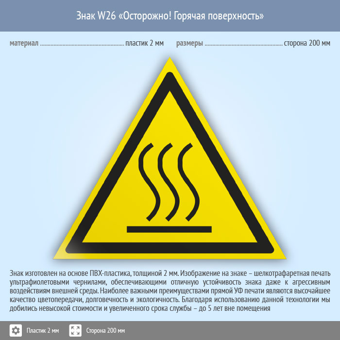 Знак W26 «Осторожно! горячая поверхность» (пластик, сторона 200 мм) в Химках купить