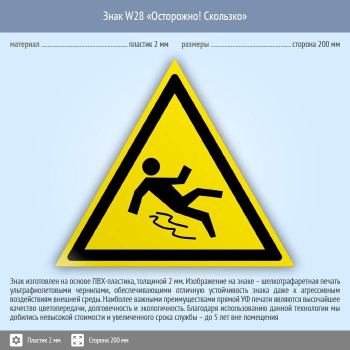 Знак W28 «Осторожно! скользко» (пластик, сторона 200 мм) в Химках купить