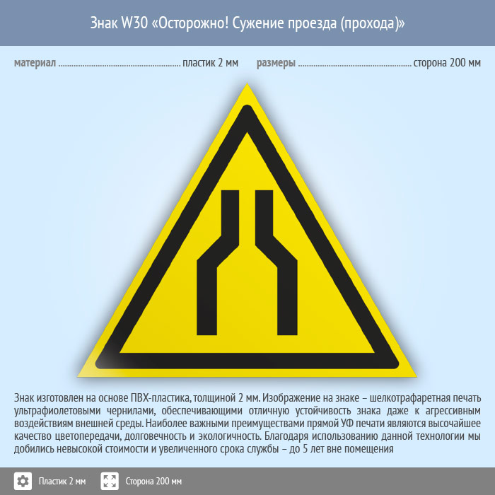 Знак W30 «Осторожно! сужение проезда (прохода)» (пластик, сторона 200 мм) в Химках купить