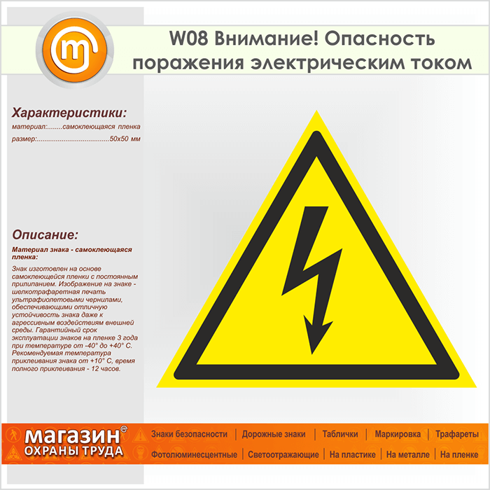 Знак W08 «Внимание! опасность поражения электрическим током» (пленка, сторона 50 мм) в Химках купить