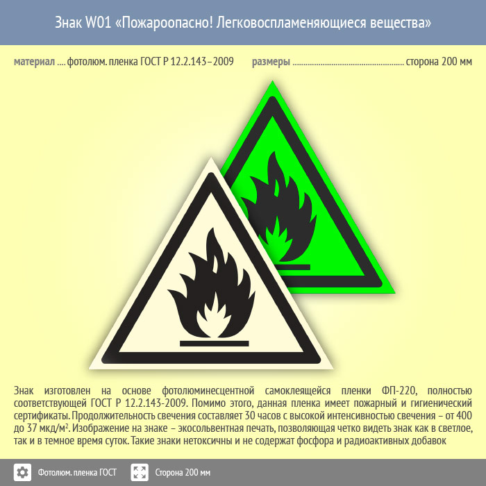 Знак W01 «Пожароопасно! легковоспламеняющиеся вещества» (фотолюминесцентная пленка ГОСТ 34428-2018, сторона 200 мм) в Химках купить