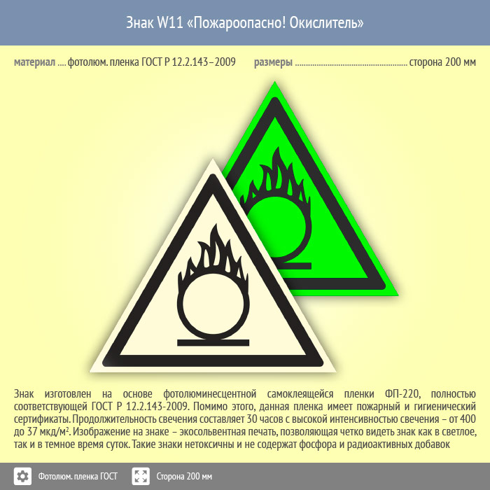 Знак W11 «Пожароопасно! окислитель» (фотолюминесцентная пленка ГОСТ 34428-2018, сторона 200 мм) в Химках купить