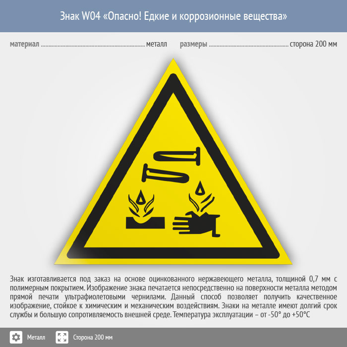 Знак W04 «Опасно! едкие и коррозионные вещества» (металл, сторона 200 мм) в Химках купить