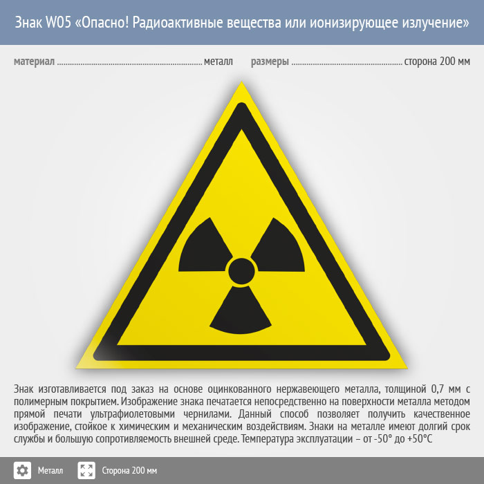 Знак W05 «Опасно! радиоактивные вещества или ионизирующее излучение» (металл, сторона 200 мм) в Химках купить