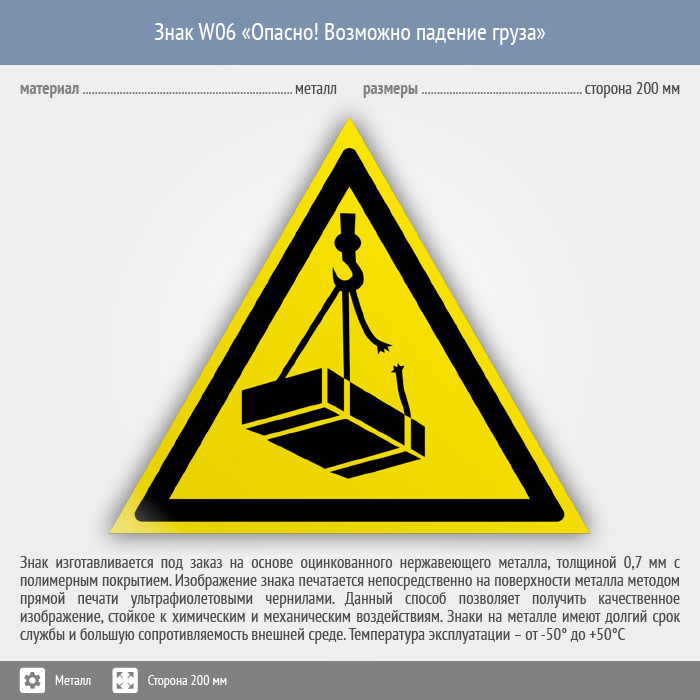 Знак W06 «Опасно! возможно падение груза» (металл, сторона 200 мм) в Химках купить