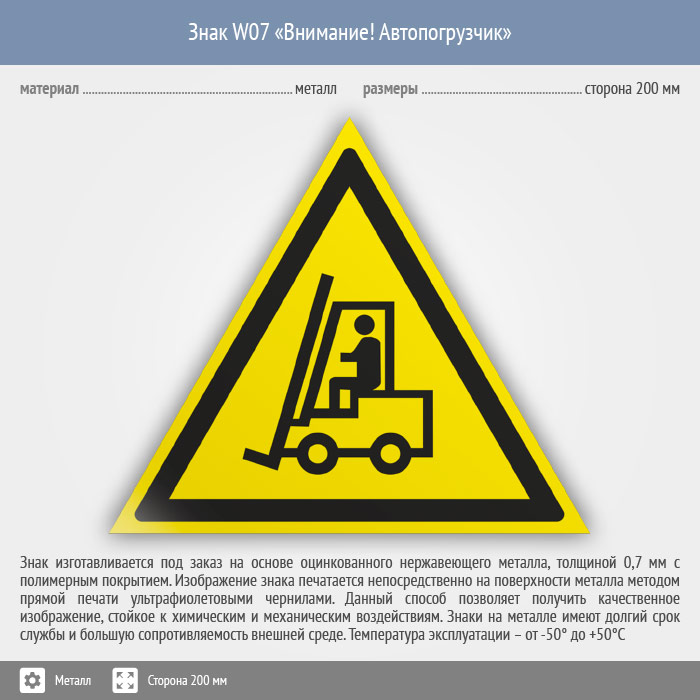 Знак W07 «Внимание! автопогрузчик» (металл, сторона 200 мм) в Химках купить