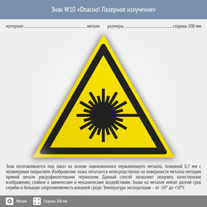 Знак W10 «Опасно! лазерное излучение» (металл, сторона 200 мм) в Химках купить