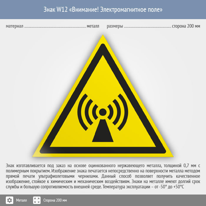 Знак W12 «Внимание! электромагнитное поле» (металл, сторона 200 мм) в Химках купить