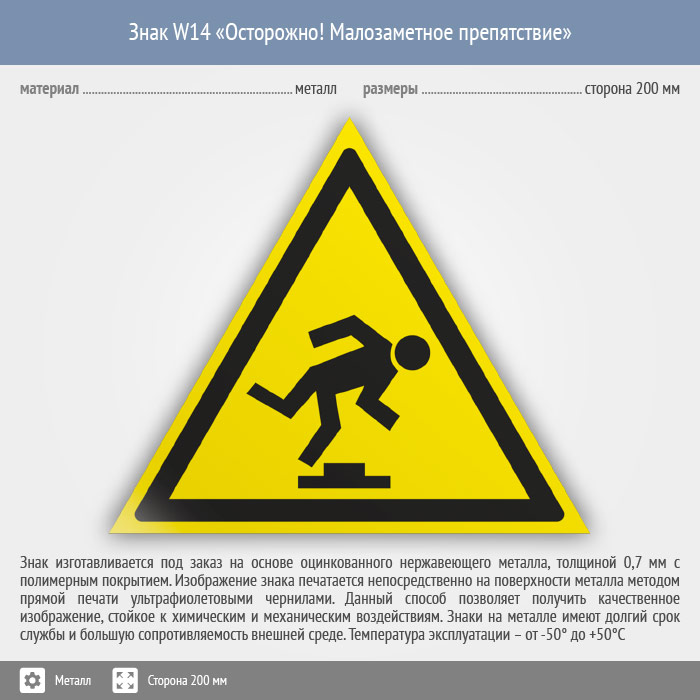 Знак W14 «Осторожно! малозаметное препятствие» (металл, сторона 200 мм) в Химках купить