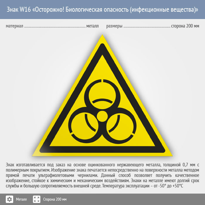 Знак W16 «Осторожно! биологическая опасность (инфекционные вещества)» (металл, сторона 200 мм) в Химках купить