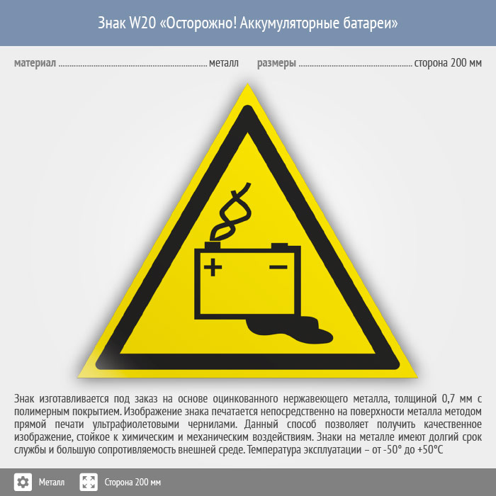 Знак W20 «Осторожно! аккумуляторные батареи» (металл, сторона 200 мм) в Химках купить