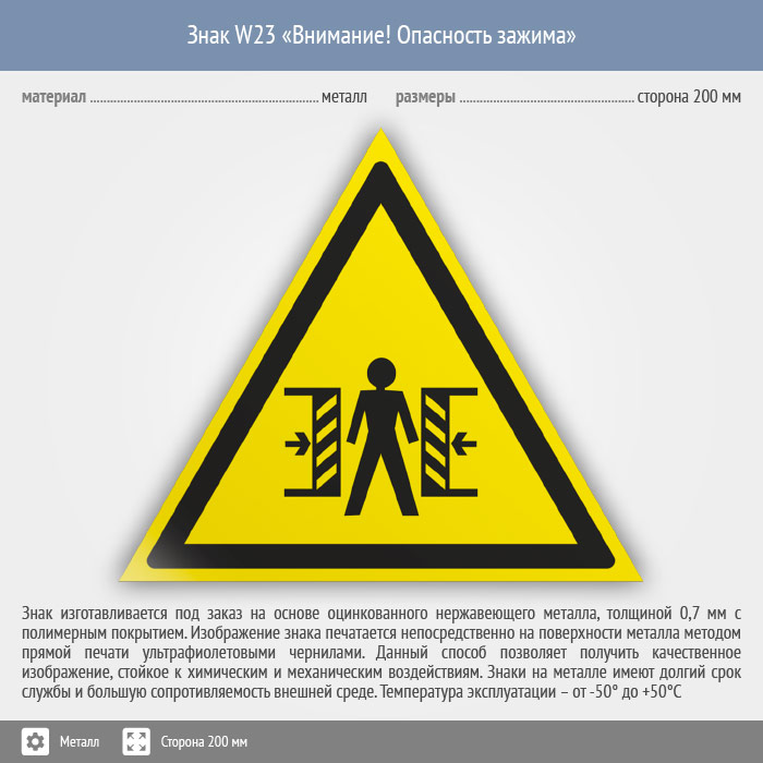 Знак W23 «Внимание! опасность зажима» (металл, сторона 200 мм) в Химках купить