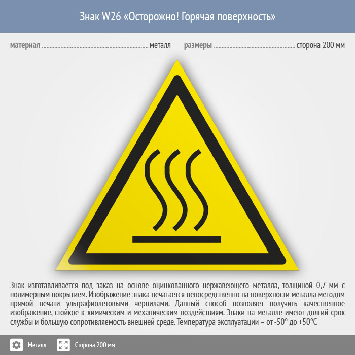 Знак W26 «Осторожно! горячая поверхность» (металл, сторона 200 мм) в Химках купить