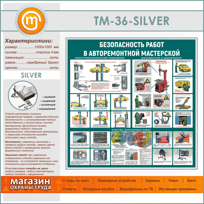 Стенд «Безопасность работ в авторемонтной мастерской» (TM-36-SILVER) в Химках купить