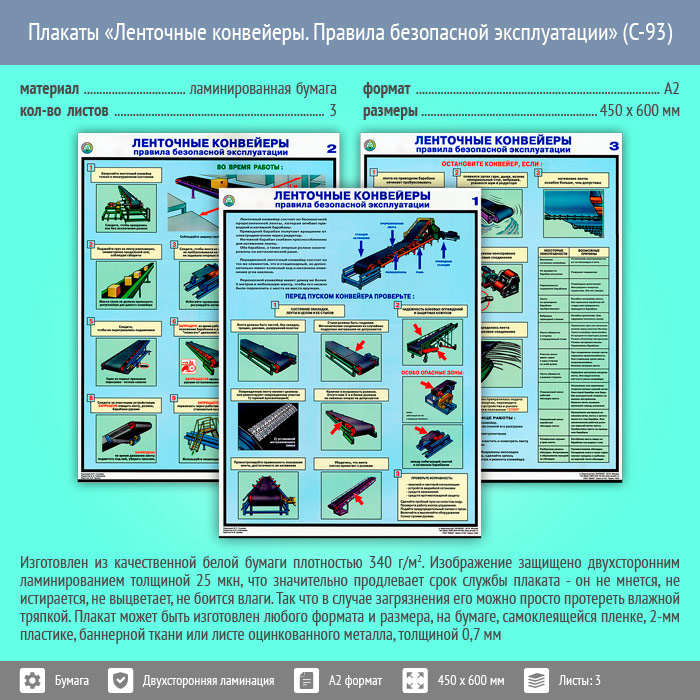 Плакаты «Ленточные конвейеры. Правила безопасной эксплуатации» (С-93, ламинированная бумага, А2, 3 листа) в Химках купить