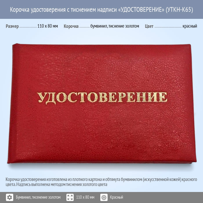Бланк удостоверения с тиснением надписи «УДОСТОВЕРЕНИЕ», красная, 95 x 65 мм (УТКН-К65) | Бланк удостоверения с тиснением надписи «УДОСТОВЕРЕНИЕ», красная, 95 x 65 мм (УТКН-К65) |
