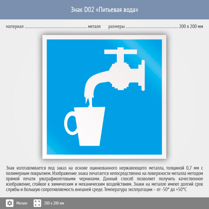 Знак D02 «Питьевая вода» (металл, 200х200 мм) в Химках купить