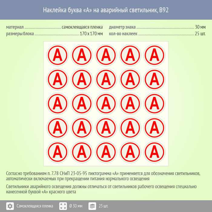 Наклейка буква «А» на аварийный светильник, B92 (пленка, диаметр 30 мм, блок 25 штук, 170х170 мм) в Химках купить