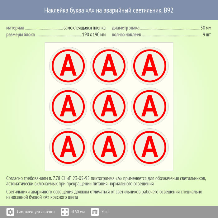 Наклейка буква «А» на аварийный светильник, B92 (пленка, диаметр 50 мм, блок 9 штук, 190х190 мм) в Химках купить