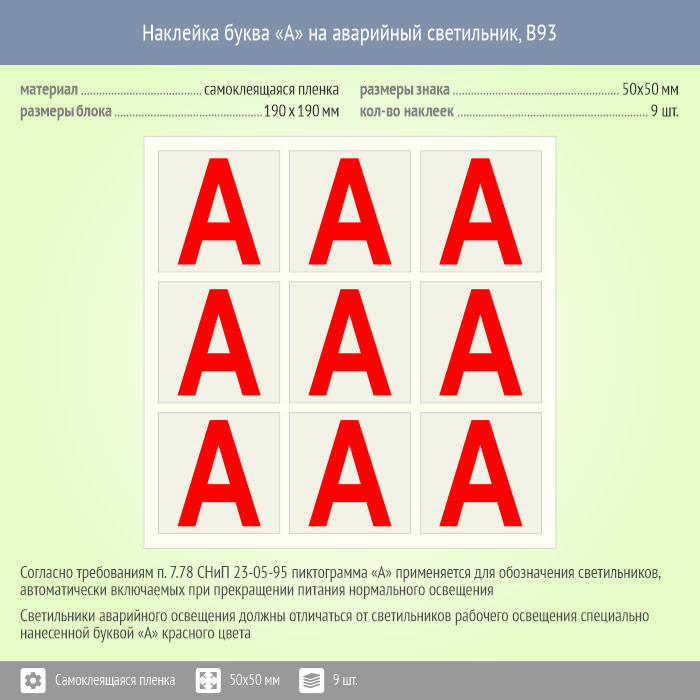Наклейка буква «А» на аварийный светильник, B93 (пленка, 50х50 мм, блок 9 штук, 190х190 мм) в Химках купить