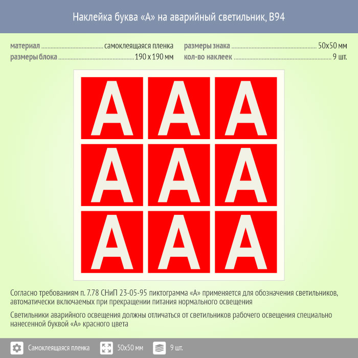 Наклейка буква «А» на аварийный светильник, B94 (пленка, 50х50 мм, блок 9 штук, 190х190 мм) в Химках купить